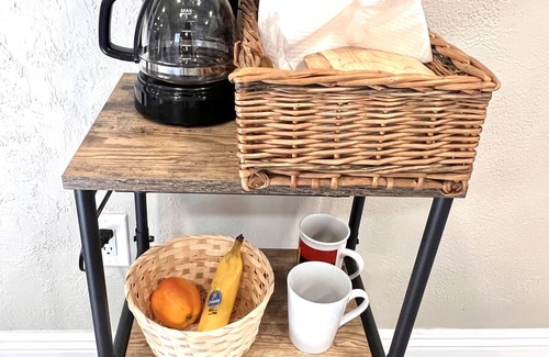 You’ll have your private entrance, straight to the room and its bathroom. The room has a small refrigerator with some water bottles and a mini coffee bar.