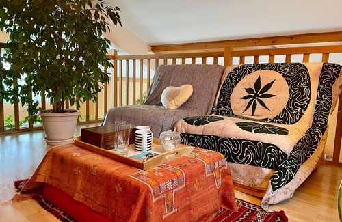 A space consisting of a double bedroom, a bathroom, and a mezzanine with a desk, armchairs, and a tea room is dedicated to you.