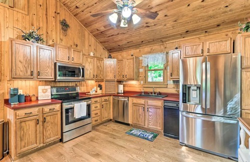 Peaceful cabin on Rough River Lake. Relax on the large deck with a cold drink. BBQ and entertain your guests while enjoying the beautiful wildlife and scenery. Enjoy yard games with family and friends on the large grassy area and chatting by the fire with your favorite drink while roasting brats or marshmallows. Take your beach chairs and stroll down the gentle path to the beach area with your partner and family for a swim in the lake or fishing from the doc. Bring your lake toys as this cabin is on the lake with a simple path to carry your toys so you can enjoy all Rough River Lake has to offer. The marina is only 6 minutes away for boats and docks to rent. The kitchen is completely stocked for entertaining your family and friends and the cabin is comfortable with two levels which allows for privacy when a little rest is needed. There are several restaurants