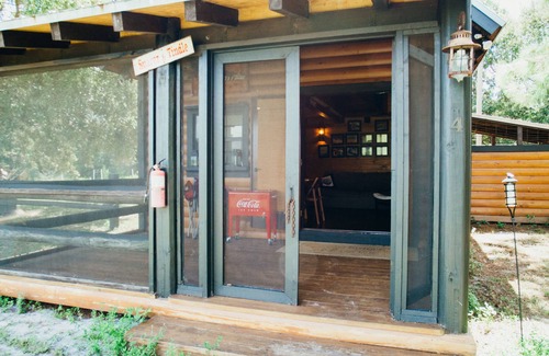 A charming, rustic cabin with 12-foot ceilings; get the "log cabin" experience with all of the modern amenities such as a screened-in porch with ceiling fan. Other amenities include a kitchen, a bathroom, a television and a large DVD collection for those rainy afternoons. Walk the nature trails, or relax by the public pool under one of our tiki huts. Fire pit available for evening marshmallow roasts.