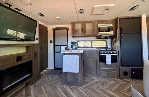Cozy Stationary Trailer – 5 Mins to Downtown Poulsbo. Sleeps up to 5 with private queen bed and full size bunks. Fully equipped kitchen with stove, microwave, and fridge. Includes bathroom with shower. Relax in the living area with TV, DVD player, and electric fireplace. Enjoy the private outdoor space with propane fire pit and outdoor griddle. Has heating and A/C for year-round comfort. Just 20 minutes to Bainbridge Ferry and close to parks, beaches, and hiking trails.
