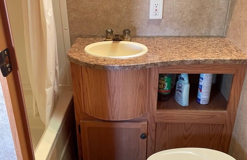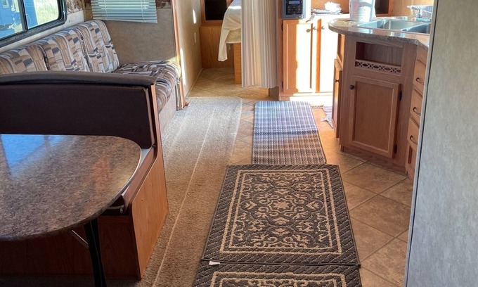 This terrific recreational vehicle is a charming and wonderful space for guests and resides on a working ranch! Animals maybe present, including cows, sand lizards and reptiles. Also, a entry gate maybe closed if leaving late night or early morning, check with host. The cozy bedroom features a comfortable queen bed, ensuring a restful night's sleep. With heating and AC, you'll be comfortable no matter the weather. The bathroom is conveniently located and well-equipped. Great for star gazing, hiking or cruising around the countryside on your electric bike.