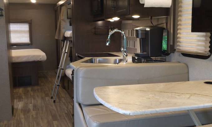 Modern, spacious Dual A/C cooled, RV is newer style in a peaceful area that is close to everything. The RV is perfect for 4 people (each with a separate bed if desired) with plenty of living space. Whether you are passing through and need a place to crash or a vacation at the beach. This RV would be a great stop. There is one separate/private king bedroom with TV, 2 twin bunks with also with TVs, upper (RV queen bunk), and various fold down couch and dinette areas. Convenient free on site parking. 5 Minutes to Juno beach and many outdoor activities, country club with pool/golf open to public.