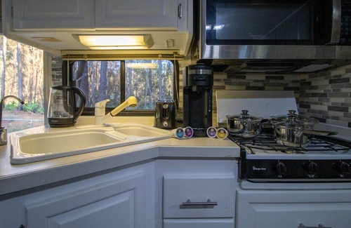 When all else fails, take a vacation! Welcome to Pine Estate. Come enjoy, glamping in our 38 ft RV located in a peaceful area, nestled between pine trees, on a secluded 5 acre farm with our friendly animals . Let us host you on a little peaceful vacation in nature, without having to give up any convenience.