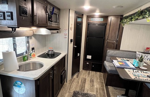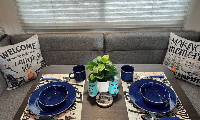Embark on an unforgettable experience of comfort and tranquility within our spacious camper, meticulously designed to cater to your every need. Equipped with a queen-sized bed, a dinette bed, a single-sized air mattress, a dining area, and complimentary wine, snacks, and water, our fully furnished camper ensures a seamless and enjoyable stay. Remember, you're in an RV and not in a home or hotel.