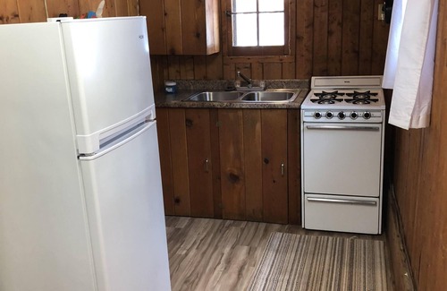 Cabin 1 is referred to as "Sailing," and sleeps 6. The cabin is roughly 400 square feet, with an open floor plan. The main sleeping area sleeps 2 on the double bed and two in the bunk beds, with queen sofa sleeper, accommodating 2 more. The living room features a sofa, chairs, and flat screen smart tv. The cabin has an updated bath and a fully equipped kitchen. The rental also provides access to paddle boats, kayaks, and paddle boards, as available. The cabin sits on a couple of wooded acres on the lake, providing waterfront, woods, and access to beaches and the pier.