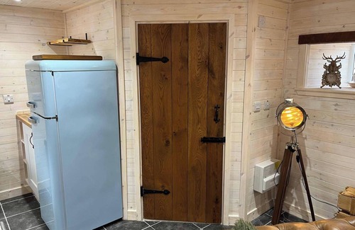 The kitchen has a fridge, a hob, a kettle, a freezer and an air fryer.
