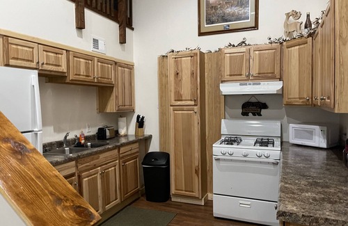 The cabin has a large TV with cable, as well as free Wi-Fi access. The kitchen has supplies for cooking, baking, toasting, microwaving, and coffee making. We also provide several other items, such as coffee, creamer, sugar, salt and pepper and many other items for your use such as a full set of dishes and silverware. We also provide some paper plates and paper cups if preferred.