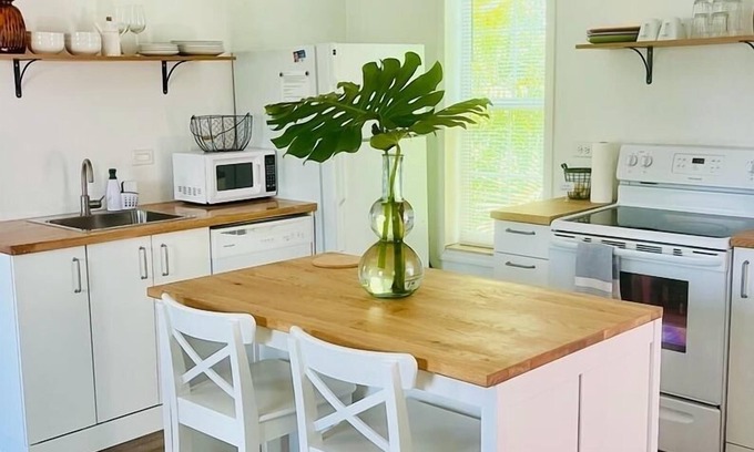Beautiful newer construction loft that offers 640 sq. feet of open floor plan. The loft sits above our two and a half detached car garage, over 130 feet from the main house. The loft offers a full kitchen, microwave, coffee maker with coffee, toaster, iron and a washer/dryer. Enjoy our complimentary farm-fresh eggs in the morning ( when the hens are laying). Our property is on 1.14 acres so you have space and privacy in your 2nd story paradise. If you have children they are welcome to play in the "island". Beach chairs/umbrella also provided. Restaurants and Publix within a mile.
