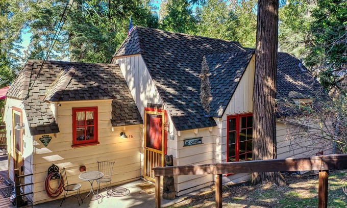 Across the street from the Lake. Small Lake view peek from the deck! (its a true peak a boo on tip toes ) This Locally famous vintage 1936 Arrowhead charmer is the ideal spot to relax and recharge your batteries of life. Nestled between tall pines and redwoods with a postage peek at the lake this is paradise! A super cozy romantic hideaway. Open floorplan with all the amenities. Wood burning fireplace, Wifi, Westin "heavenly bed", soaking tub/shower, galley kitchen, and an enormous outdoor deck.