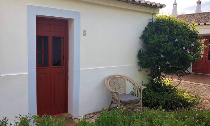Cozy room at the rural Monte Rosa guesthouse, close to the seaside town of Lagos. The room has a double bed (1.55m x 2.00m), ideal for 1 or 2 persons. In red and creamy colors, the room features a small kitchenette with fridge, coffee machine and kettle, a bathroom with shower, toilet and sink. It is equipped with electric heating and has a very private terrace overlooking the garden. There's a communal self catering kitchen available for cooking. Guests have access to the swimming pool, yoga lessons and many other activities.