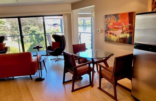 A rare find for business or leisure, this 2 bedroom 2 bathroom city condo with river views is perfectly located. A comfortable home you will love, thoughtfully designed for work or play with modern decor. Warm and tranquil. Nature nearby with moving waters. Calm, positive vibe. High speed internet, TV, seasonal pool & year-round hot tub, private washer & dryer. Two (2) covered deeded parking spaces. Onsite security & convenience store. Centrally located close to transit. No chores, no fees, no taxes on 31+ nights, no smoking, no children, no pets. Fully equipped kitchen, and top quality mattresses. Very walkable in a pretty location. Gated complex with private security guards. Safe, private keyless entry. Steps to transit, streetcar, Union Station, and light rail with easy airport connections. Located on our city's fantastic Riverwalk trail system with 15+ miles of connections to parks and the city for bicycle and pedestrian use. Perfect for work, play and convenient living.