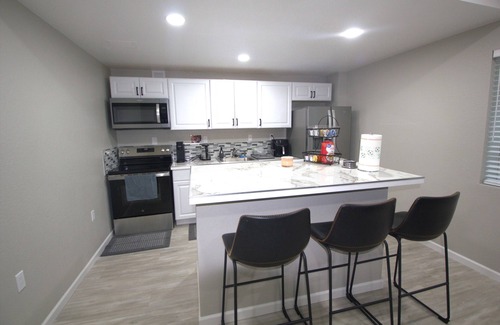 The fully equipped kitchen includes a refrigerator with a water dispenser and ice maker, electric stove and oven, air fryer, kettle, coffee maker, toaster, and all the essentials for cooking and dining. A bar-height island with seating makes meals and conversations easy. With high-speed WiFi, a smart TV, central AC and heat, and thoughtful touches throughout, you’ll have everything you need for a convenient and enjoyable stay.