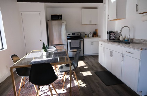 The master Bedroom has a large 55" TV with an Apple TV that has Netflix and Hulu. The bedroom with a King size bed, full bathroom and kitchen are all located on the 1st floor. A spiral staircase leads to the upstairs living room loft area that has an additional TV with Netflix, a diverse DVD Collection, board games, and a large very comfortable down filled sectional and ottoman. There is a second tiny room with a bed (full size) off of the living room area upstairs that can sleep 2 additional guests. Brew a fresh cup of coffee or tea in the Keurig and enjoy the morning view on the patio.