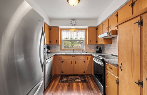The Blue Cottage at North Lake has been completely refurbished with 2 main levels featuring a modern yet rustic lake house atmosphere. Our guests are surprised and elated at how clean/spotless we keep our cottage! NEW Fiber-optic Internet Speeds. The kitchen features new appliances and is well stocked. The large new deck is a great place to dine and absorb the beautiful sunsets. North Lake is a 65-foot deep, 132-acre spring-fed lake where water recreation is fun and easy with a nice sandy beach, clear water, a new dock, and many water toys including kayaks and paddle boards. A new Bennington Pontoon Boat is rentable. North Lake has great fishing with many bass, perch, and blue gill ready to strike your lure. Adirondack chairs surround the fire pit and two new large TVs offer additional nighttime entertainment in addition to star gazing from the pier. For families, a big bonus is that the kids can watch their TV shows and shut the downstairs door while the adults watch Netflix, Hulu, the Lions, or whatever :).