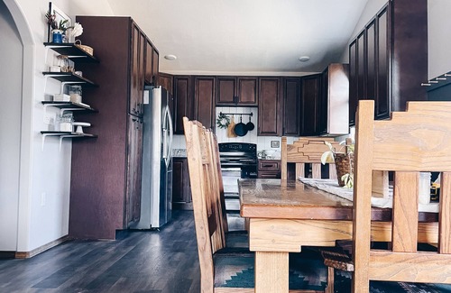 Relax with the whole family at this beautiful, peaceful home in Cortez. This three bed, two full bath home is perfect for families. Chappell Farms Stay is centrally located on a working wheat and pinto bean farm, with 360° views of mountains and farm land. While your stay will feel remote, you won’t be far from hiking, lakes, mountains, trails, slopes, and parks. One mile from sand canyon, 20 miles from mesa verde, 60 miles from telluride, 2 hours from Moab.