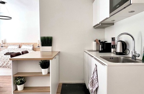You'll find a bright space with a double bed, lounge area, TV, fully equipped kitchen, modern bathroom with walk-in shower, and a private balcony for your moments of relaxation. Perfect for a central and comfortable stay, close to shops, restaurants, and major tourist attractions.