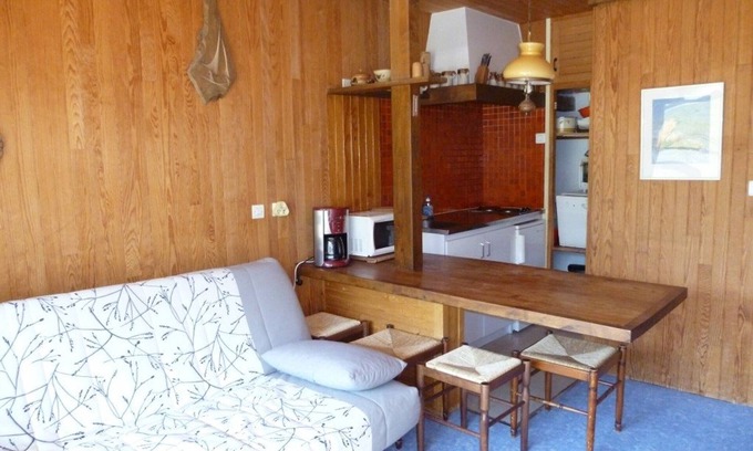 Studio for 4 people, on the 5th floor of the Super Arlas residence, with direct access to the shopping mall and the slopes. Residence with elevator from the parking lot. Your property is composed of an entrance with a bunk bed, 2 single beds, the living room with fitted kitchenette and dining area, a 2-seater BZ sofa, a bathroom with toilet and a balcony overlooking the slopes.