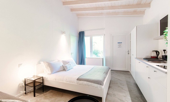 The studio apartment is furnished with a double bed and a single sofa bed (Please note: The sofa bed will not be prepared as a bed for your arrival, as we deem it proper to use it as a sofa during the day. You will find the bed linen, pillows and blankets in the wardrobe/shelf closest to the sofa.), to accommodate up to 3 people, a table to have lunch and dinner which can also be used as a desk for working and studying, a TV and a small kitchen equipped with the necessities for preparing meals. The bathroom with shower concludes the studio apartment.