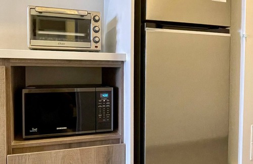 The studio itself is quite cozy and features one smart TV, a queen bed, blackout curtains, All-in one washer/dryer, microwave, oven, hair dryer, iron, and ironing board. We also provide complimentary wi-fi, and access to local entertainment and sports networks.