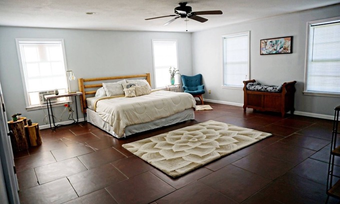 Enjoy the peaceful outdoors with a warm cup of coffee on our outdoor patio, watch the fireflies, or spend some downtime in our cozy but large studio style home with a nice reading nook and a large enough couch for 5 to relax. There's a king size bed in the bedroom, room for a guest or two to sleep on the couch and plenty of floor space to bring some blow up mattresses.
