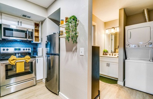 Indulge in the warmth of hardwood floors and local art-inspired pops of color. Whether you're whipping up breakfast in the fully equipped kitchen or unwinding on the sofa, you're perfectly poised to dive into Austin's renowned music scene or explore the Trendy Domain for the best in shopping and dining.