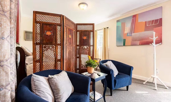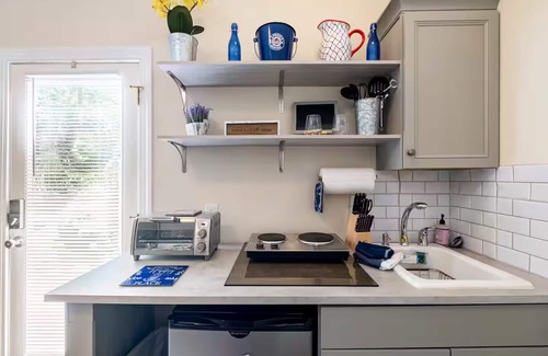 Newly decorated and finished, this clean studio space has everything you need for a pleasant, quiet stay. Brand new memory foam queen bed with luxurious high thread count linens will ensure sweet dreams! Kitchenette has microwave, toaster oven, refrigerator and cooktop. Step into the large, open shower with dual high pressure shower heads to ease away the stress of the day...Comfortable, clean and very affordable!