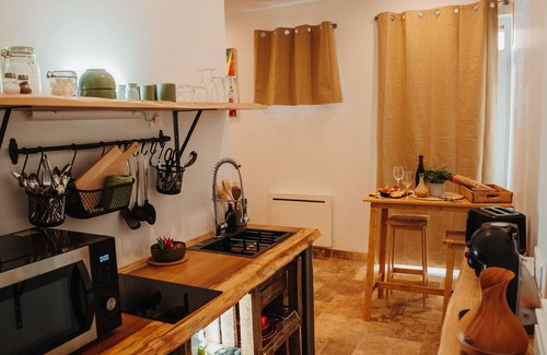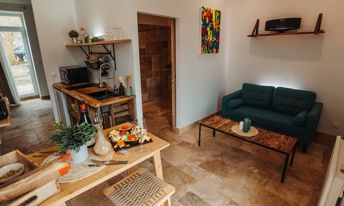 Treat yourself to a relaxing break in the countryside and enjoy the peace and authenticity of Domaine des Terres d'Argile! Charming single-story studio with a living area (sofa, wall-mounted projector with TNT channels, Netflix, Disney+, Prime Video, etc Wi-Fi), an open-plan kitchen, a sleeping area with a 160x200 cm double bed, and a separate bathroom with toilet.