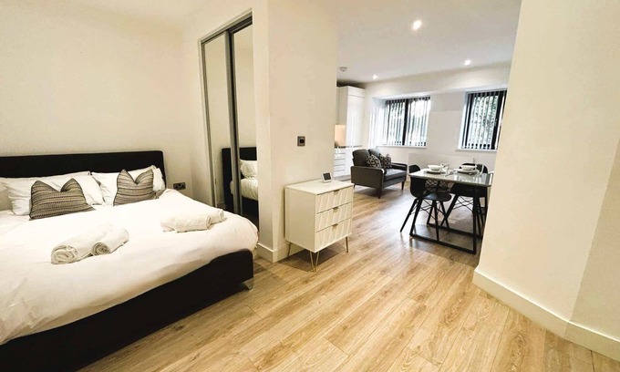 One of the Solihull's new development has been meticulously crafted to meet the needs of the modern traveller; we’ve thought of everything. This studio with windows flood light into it for a bright and airy feel, and the modern and open-plan living spaces enhance this vibe. The apartment is kitted out a double bed, built in wardrobe, smart TV, high speed WiFi, all kitchen appliances, amenities and 1 parking space as standard life a breeze for residents - especially after a long day hitting the shops or in the office. Whether you’re sinking into our plush sofa for a Netflix binge or hosting friends in the sociable open-plan living space, this is the perfect spot to recharge, entertain and feel inspired.