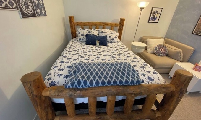 This adorable space offers a cozy bedroom with queen log bed, private bathroom, heating, WiFi, and a hair dryer for your convenience. Great location. Private entrance. Close to hiking trails. Love to host you!