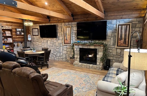 Studio Log Cabin with fold down Queen Murphy bed. Full Kitchen including residential refrigerator, microwave, oven, gas cooktop and air fryer. Bath room includes shower, sink and toilet. Large living room with gas fireplace and large smart tv. Living room also has reclining couch and message chair. There are two Adirondack chairs and 4 person Hot Tub under a covered front porch. The Cabin is located in my back yard. You will use my drive way and take the seperate sidewalk back to the cabin.