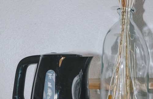 Fully equipped kitchen: electric cooktop, Nespresso coffee machine, kettle, refrigerator, microwave, complete set of dishes, pans, pots, utensils, and basic essentials.