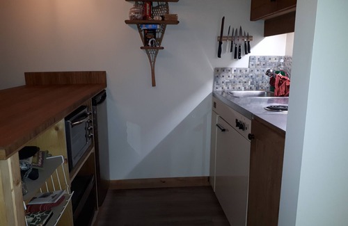 Fully equipped kitchenette with 2 burner stove, small oven, microwave, slow cooker, two mini fridges, and plenty of counter space on the custom built island. There is a French press for making coffee as you watch the snow fall out the Juliette balcony.