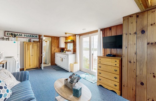 Awaken to a lovely view of the water in the lofted sleeping space of this upstairs studio, perfect for a quiet getaway. Head downstairs to your main living space for breakfast – there’s a full kitchen (no dishwasher) and that same lovely view to enjoy as you eat. Or, if it’s nice outside, head to the picnic table and dine alfresco. Spend the day hiking or biking nearby, or head to Acadia National Park, 30 miles away. When you return to your cozy studio in the evening, amazing sunsets await, and a comfortable couch and flatscreen TV are at the ready for your entertainment needs. Head up to bed, with the nighttime stars replacing the sunrise for your view.