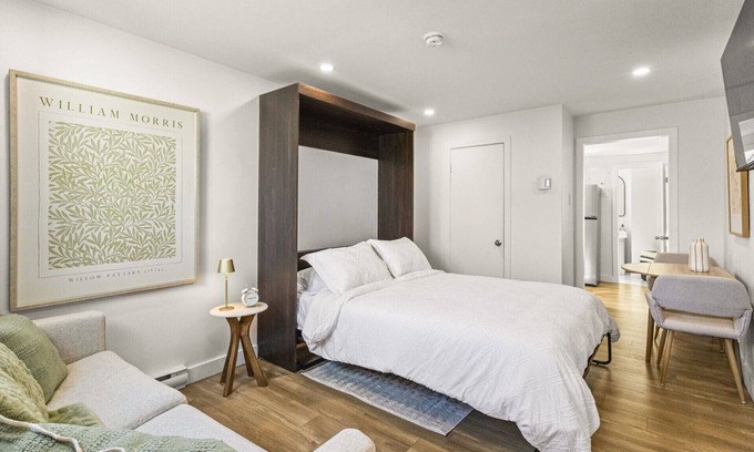 Cozy studio with a Queen Murphy bed, welcoming couch, and large smart TV with all your favorite streaming apps. Enjoy a full kitchen with modern appliances and a complete bathroom. Just 15 mins from the airport and Place Bell Laval, and 25 mins to downtown Montreal. Perfect for business or leisure stays!