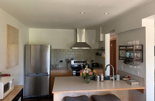 Inside is a simple and clean kitchen with a glass range and large fridge and freezer. A BBQ is available for guest use, if you want to venture outside of the kitchen. We have most of the kitchen items you need to cook a meal, but for guest safety we are currently not providing any pantry basics. We do provide tea and coffee for the first night of your stay (Keurig and individually packaged tea bags). There is a French Press for those who prefer to bring your own favourite roast with you.