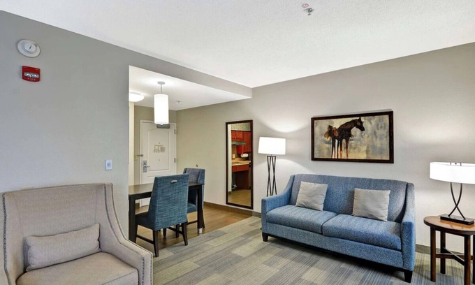 This suite is a cozy space to unwind and refresh, we are equipped with a full-size kitchen where you can feel at home and so can your four-legged friends. We offer a complimentary hot breakfast, lively socials on Wednesdays, and amenities such as a fitness center and a seasonal outdoor pool to enhance your comfort during your stay.