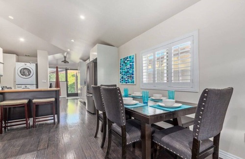 The heart of the home lies in its spacious dining area, able to comfortably host up to six. This space smoothly transitions into the fully-equipped kitchen, showcasing an open-concept design that includes additional high-top island seating for two. Brick accents and quartz counters add character to the kitchen, along with a robust stove and a suite of sleek stainless steel appliances, including a three-door refrigerator, stove, and dishwasher. A full-size washer and dryer are also conveniently located off the kitchen, making your stay as effortless as possible.