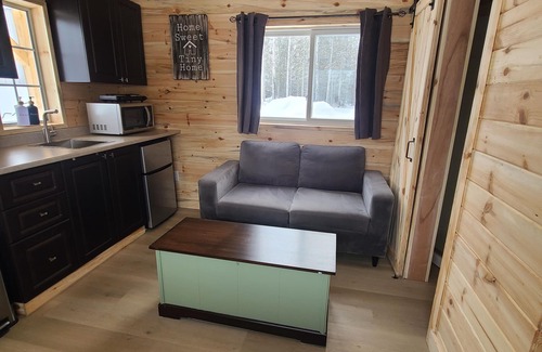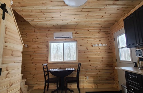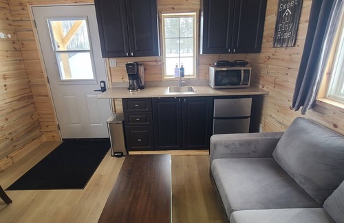 Step inside to find a warm, wood-finished interior that invites relaxation. A comfortable seating area lets you unwind with a good book or board games. The fully equipped kitchenette has everything you need to prepare meals, from a two-burner stove and microwave to cookware, air fryer, cutlery, and coffee maker. Enjoy your morning coffee while gazing out at the trees or step outside onto your private deck to breathe in the fresh country air.