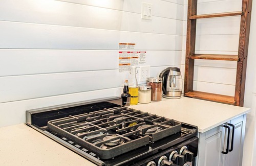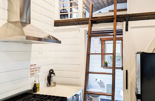 Despite the home’s tiny footprint, the vaulted ceilings make the living area feel quite spacious. The living space includes a comfortable sectional pull-out. Cozy up on the couch with a good book or a board game and enjoy this unique stay experience. There is a small tv with ChromeCast access so you are able to cast from your phone, tablet or computer any of your streaming sites. **NEW JUNE 2024** We have installed an awning that extends the length of the Tiny Home providing a covered area to dine and relax outside.
