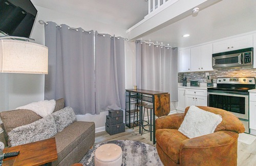 Step into the fully equipped kitchen, featuring sleek, full-sized stainless steel appliances including a French door refrigerator, oven with stovetop, mounted microwave, and ample cabinet space above and below. The elegant quartz countertops provide just the right amount of room to prepare anything from a full meal to a quick snack. You'll find all the essentials stocked and ready, such as dishes, glassware, silverware, cookware, a toaster, coffee maker, and more. Prefer dining out? You're just minutes from hundreds of award-winning local restaurants, and delivery services like Uber Eats and DoorDash make staying in easy and convenient.