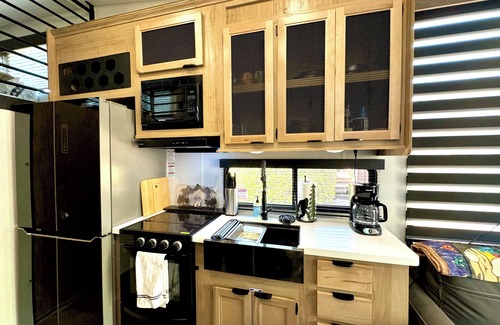 When you pull in the driveway you will see the brand new tiny home next to beautiful trees and outdoor dining area. The front porch greets you with a bistro style seating area. Step inside and be welcomed by a beautifully designed Bigfoot-themed interior that seamlessly blends modern comforts with rustic charm. The living area is perfect for lounging, with plush seating and a flat-screen TV for your entertainment. The kitchen is fully equipped with all the essentials, including a stove, microwave, and refrigerator, allowing you to prepare your favorite meals with ease. You'll also find a coffee maker and a selection of coffee and teas, perfect for enjoying a morning brew on the front porch.