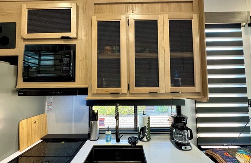 The bedroom offers a deluxe RV king-size bed with soft linens, ensuring a restful night's sleep. The cozy loft offers a comfortable RV king sleeping space with an excellent indoor fireplace, perfect for relaxing evenings. Additionally, the loft provides great views of the surrounding nature, making it a serene spot to unwind.