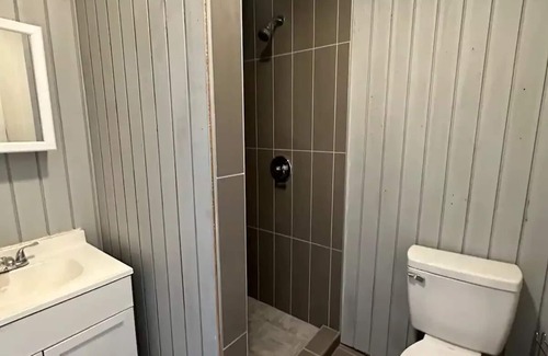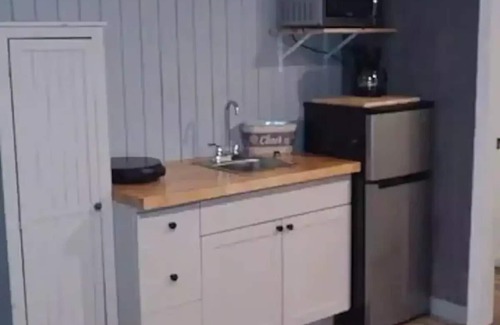 Experience rustic charm in our one-room, one-level tiny home. Adorned with warm wood walls, it features a queen bed, nightstands, 2 chairs, and a TV. The kitchenette boasts a sink, stove top, fridge, microwave, and a stocked cabinet. Refresh in the bathroom with a stand-up shower. This thoughtfully designed space blends comfort and functionality for your perfect getaway.
