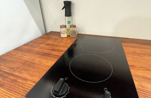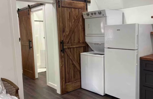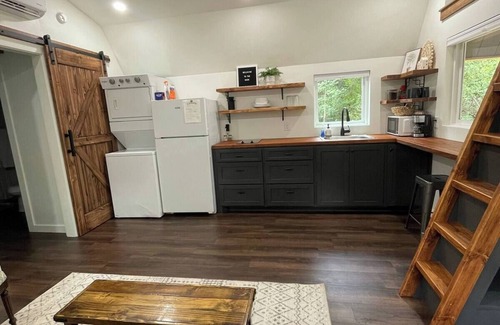 This a 1 bedroom tiny home with a loft bedroom overhanging the porch! It has a small kitchenette with a fridge, stovetop, microwave, & coffeepot. It is stocked with the essentials! The bathroom has a shower only! It is a lovely, wooded setting!