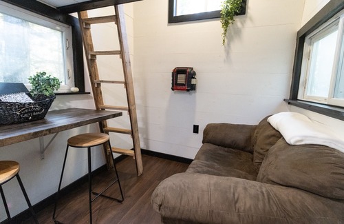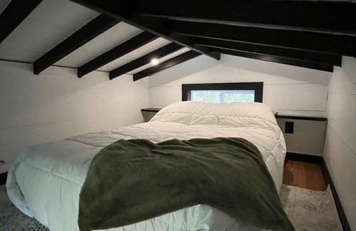 The tiny home is located in my woodsy back yard. We have 7 acres of land, most of it being forrest, great for peace and quiet and exploring. There is a walking path that takes you out to see a beautiful mtn view. The tiny house itself is around 100sq ft. with a loft. There is a butcher block countertop to cook on (a propane stove top provided) or to enjoy meals. A separate outdoor outhouse, with a compost toilet and a small living room space with a super comfortable love seat.