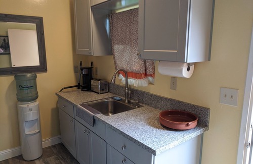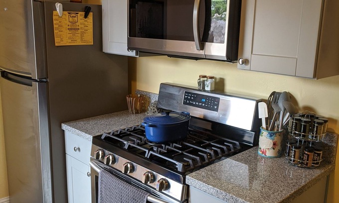Take it easy at this unique and tranquil getaway. A newly re-modelled efficiency apartment featuring a full kitchen with granite countertops, full sized appliances, and all essential bathroom with soaking clawfoot tub and shower, and a combination living room (by day) / bedroom (by night). Couch pulls out into a confortable queen bed (an extra thick foam topper is also provided). Small fenced yard with peaceful night lighting, shade, patio and picnic tables with plenty of seating.
