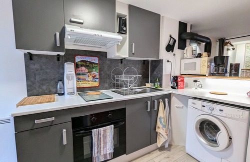 Ground floor: living room with equipped kitchen area: washing machine, 2 induction hobs, oven, microwave, coffee maker, kettle, toaster, fridge and freezer, raclette and fondue set, plancha. / TV corner. / Shower room with shower cubicle and toilet.