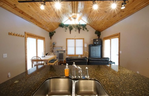 Designed as a vacation home, this cabin has two private bedroom each with a queen bed and private bathroom. It also includes a full kitchen and great room/dining area.