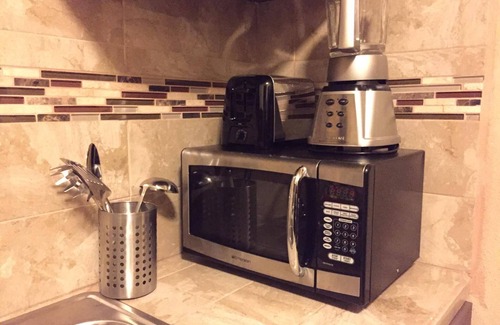 Has amazing kitchen, perfect for going to the local grocery (just one block and cooking home-made breakfast! Super comfortable living room and dining table with plenty of light.